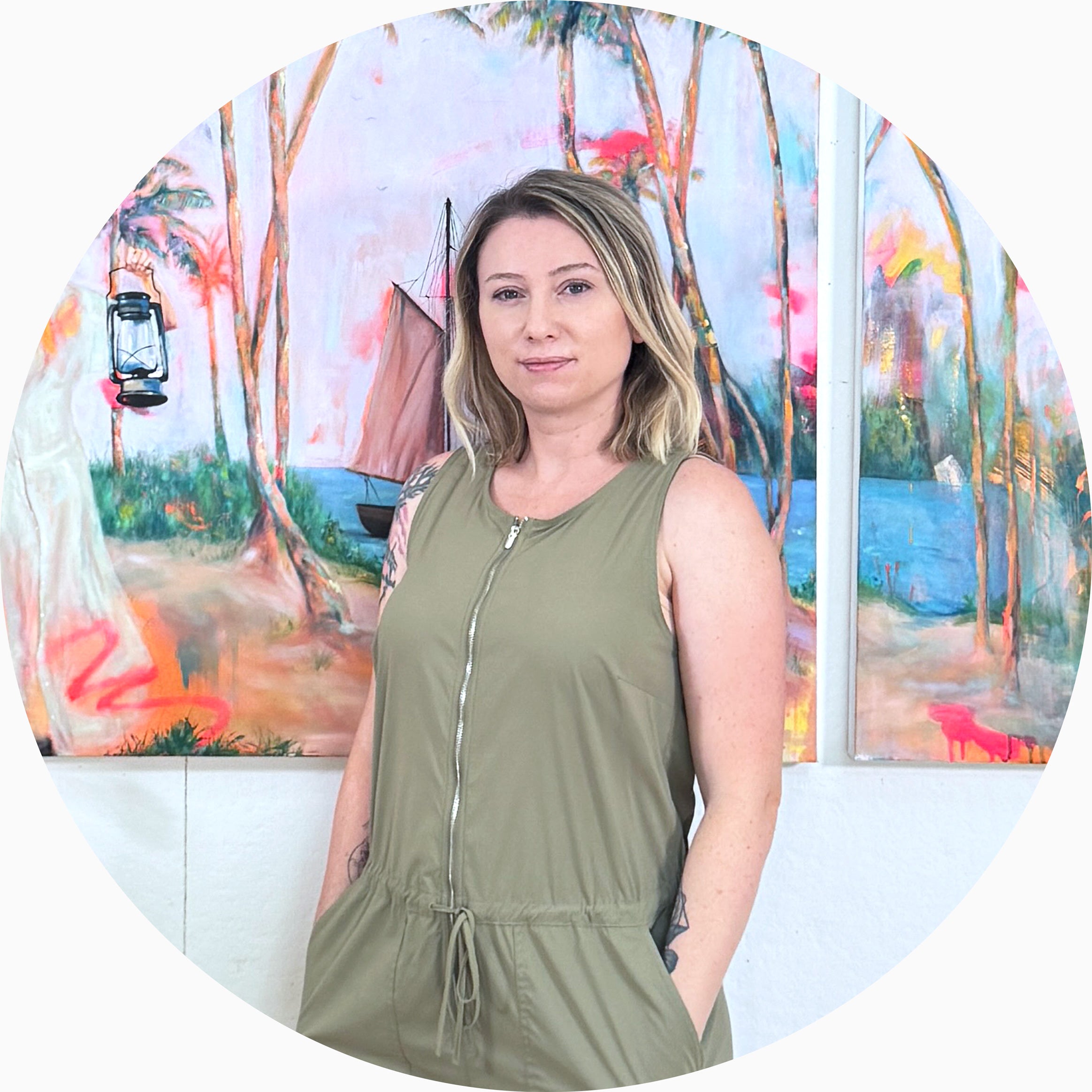 Inspired by post-expressionism, speculative fiction, nature, and graphic design, Vanessa’s paintings use bright color, texture, shape, and mixed media to create expressive, layered environments. Her work combines narrative concepts with contemporary painting techniques, influenced by themes of curiosity and bravely navigating unfamiliar possibilities.